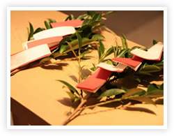 玉串とは、栄木(葉っぱ)の枝に紙片をつけたものです。